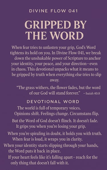 When fear tries to unfasten your grip, God’s Word tightens its hold on you. In Divine Flow 041, we break down the unshakable power of Scripture to anchor your identity, your peace, and your direction—even in chaos. This devotional unpacks what it means to be gripped by truth when everything else tries to slip away.