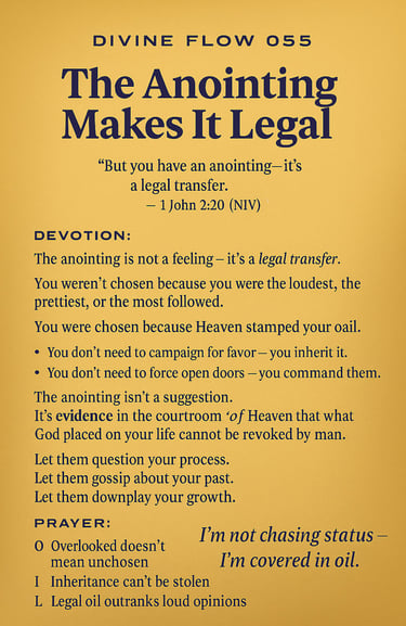 Your anointing is a legal transfer—not a feeling or a trend. This devotion exposes why God’s stamp on your life overrides opinions, opens doors without force, and protects your calling from being revoked.