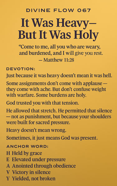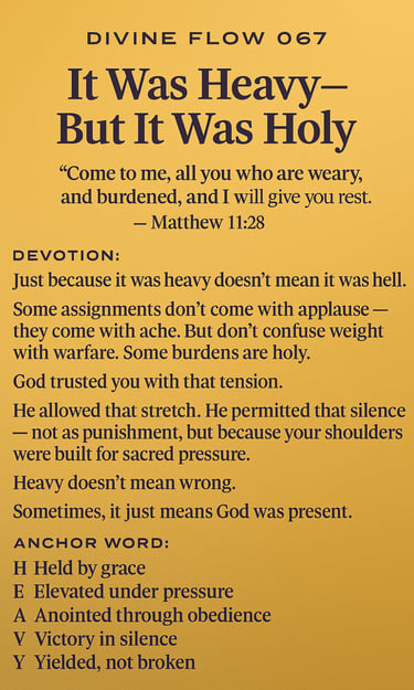 Just because it was hard doesn’t mean it was wrong. This raw, power-filled devotional unpacks how God uses weight to refine, not punish. If you’ve been feeling burdened by obedience, Divine Flow 067 will shift your perspective and remind you: some loads are heavy because they’re holy. Featuring the acronym HEAVY, a bold affirmation, and a closing prayer for spiritual endurance.