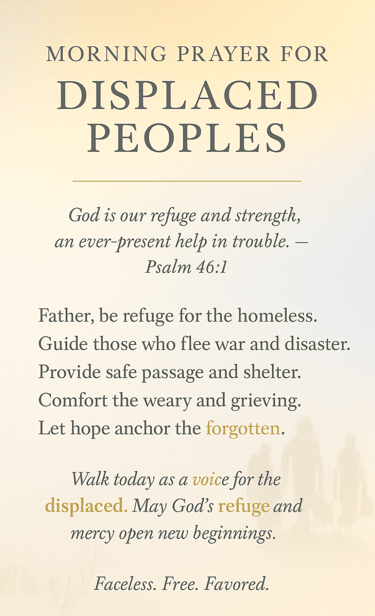 Walk into today as a voice for the displaced. May God’s refuge surround the homeless, His strength sustain the weary, and His mercy open new beginnings.