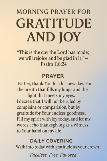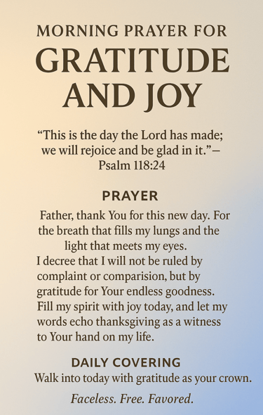 Daily Covering: Walk into today with gratitude as your crown, peace in your spirit, and favor opening every door. May joy clothe you like armor, and may thanksgiving unlock provision in every place you tread.