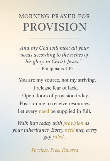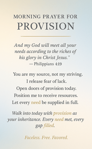 Start your day with this prayer for provision. Trust God to supply your needs, open doors of favor, and release resources for every assignment today.