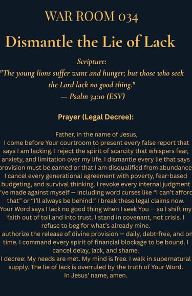 Scarcity is a demonic doctrine. War Room 034 confronts the lie that you are disqualified from provision and exposes the spiritual agreements we’ve made with poverty, fear, and survival. This prayer dismantles those strongholds and repositions you to receive abundance in Christ.