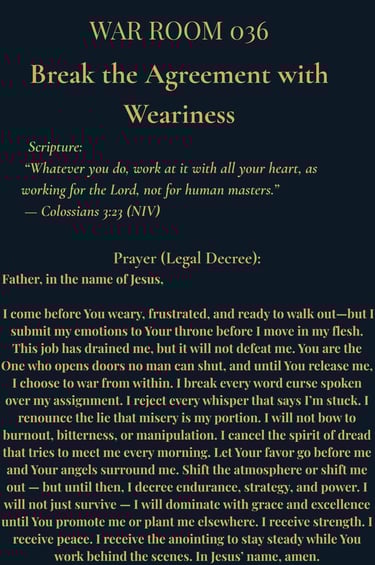 Feeling stuck, drained, and ready to walk out? War Room 036 is for those silently suffering under the weight of a job they hate. This legal prayer decree severs agreements with dread, burnout, and emotional defeat—while invoking supernatural strategy, strength, and divine promotion.