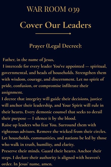 Leadership is a spiritual battlefield, and our silence leaves openings for enemy influence. This War Room devotional intercedes on behalf of leaders across every realm—governmental, spiritual, parental, and personal. If they lead, they must be covered. This is a legal decree for divine protection, righteous counsel, and Spirit-led decision-making.