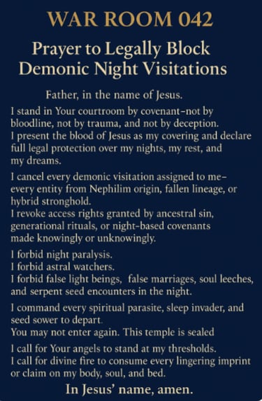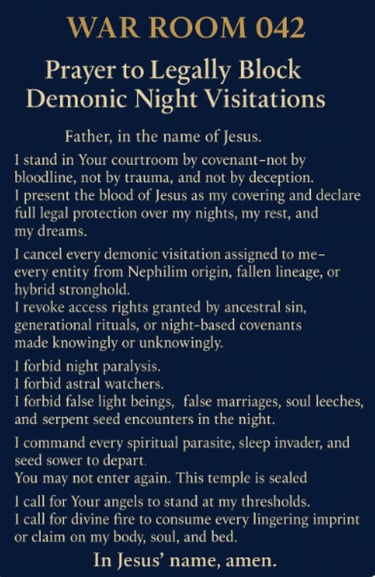Night isn’t just for rest—it’s for invasion. Sleep is often where demonic powers attempt to reassert access, especially through dreams, paralysis, soul travel, or Nephilim-lineage assignments tied to generational corruption. This prayer blocks all unauthorized night visitation, shuts spiritual portals, and reclaims jurisdiction over your body, bed, and bloodline.